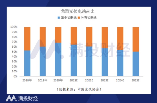 光伏应用市场类型有集中式和分布式两种,从占比来看,我国光伏电站以大型集中式为主。根据 CPIA(中国光伏协会)数据,2020 年,大型集中式电站占比为 67.8%,分布式电站占比为 32.2%。随着光伏在建筑、交通等领域的融合发展,叠加户用的应用规模,屋顶分布式光伏将加速发展,预计未来分布式光伏电站占比也将提升,成为未来的发展主流。