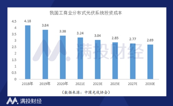 以我国工商业分布式光伏系统的投资成本为例,据 CPIA 数据,近几年来,我国工商业分布式光伏系统的投资成本逐年下降,由 2018 年的 4.18 元/W 下降至 2020 年的 3.38 元/W,预计未来仍呈下降趋势,至 2030 年将下降至 3.24 元/W。随着光伏行业的投资成本的持续降低,行业成长属性加强,行业景气度提升。