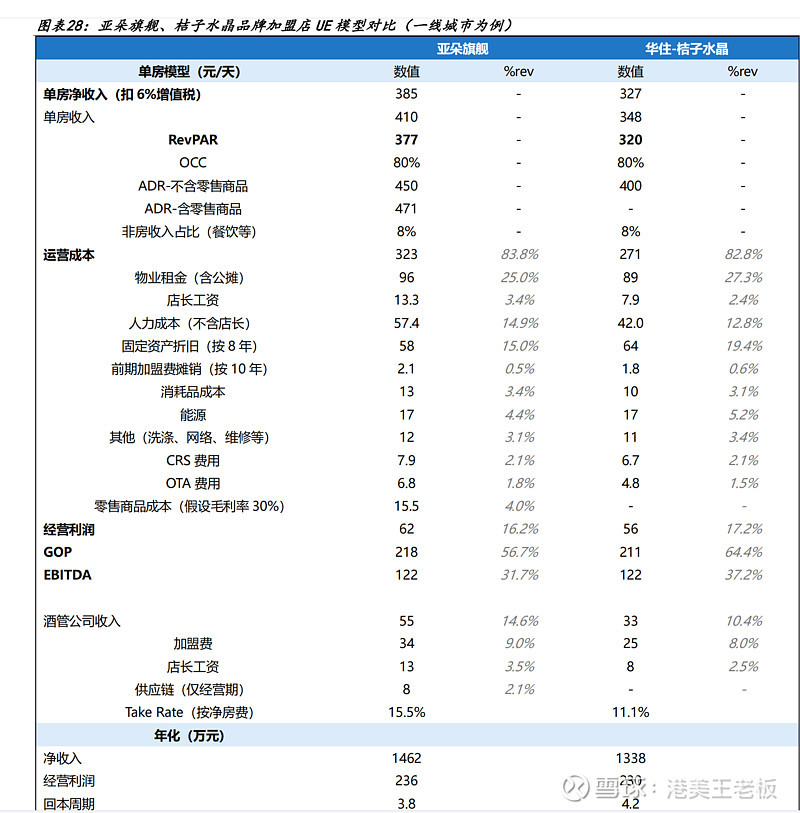 下面是券商做的亚朵和桔子水晶的门店 UE 数据对比: