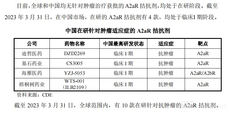 DZD2269是迪哲医药自研的全球创新型高选择性腺苷 A2a 受体拮抗剂(A2aR Antagonist),全球范围内尚无 A2aR 拮抗剂产品获批,国内市场还有 3 款同类产品在研。