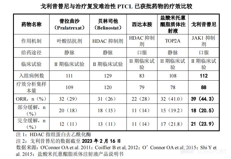 截至 2023 年 2 月 16 日的国际多中心注册临床数据显示,戈利昔替尼在Ⅱ期推荐剂量(150mg)水平的客观缓解率达到 44.3%,且在既往接受过 HDAC 抑制剂的患者中亦显示疗效。