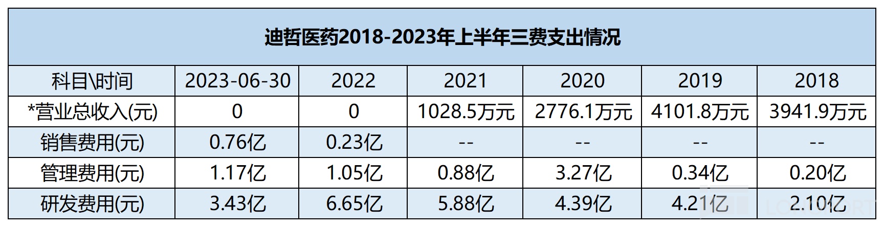 2019-2022 年,迪哲医药的研发费用分别为 4.21 亿元、4.39 亿元、5.88 亿元、6.65 亿元,研发投入持续加大,2023 年上半年为 3.43 亿元,同比微增 4.2%。这意味着,公司在过去四年半已累计投入 24.56 亿元。