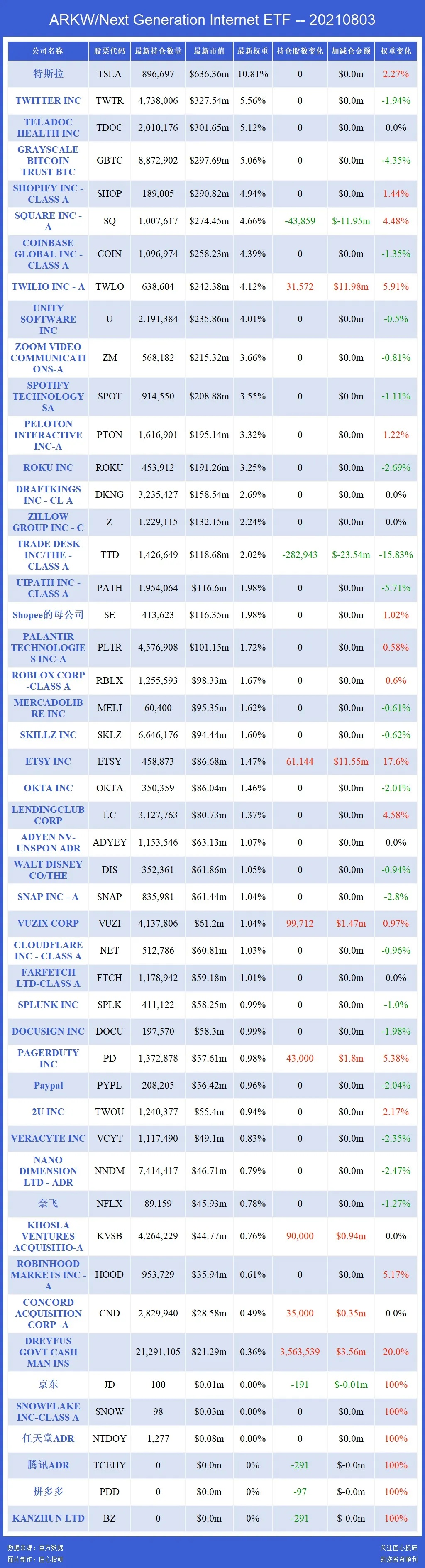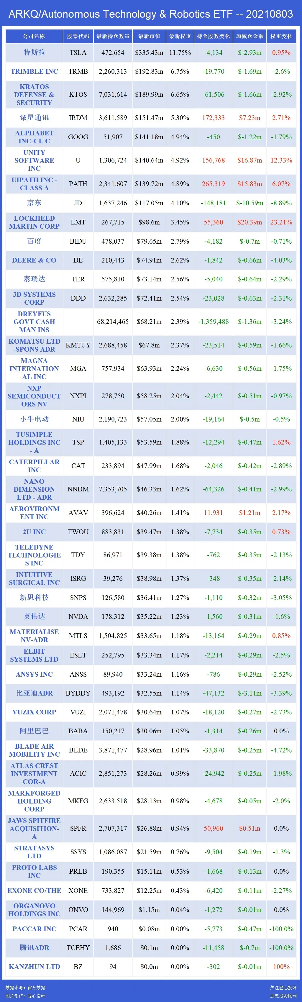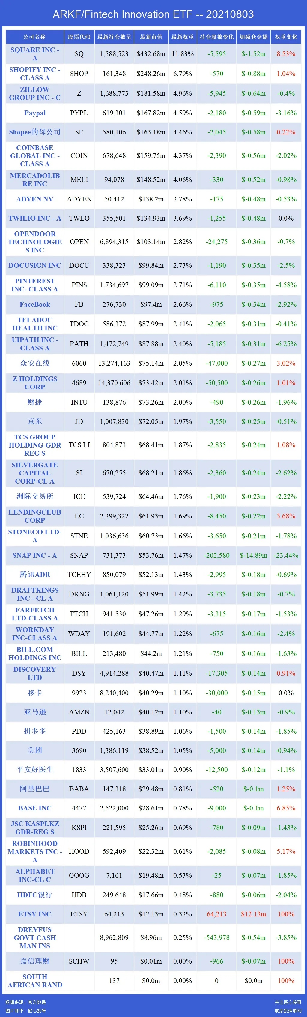 2021 年 8 月 2 日:增持 LMT、U、PATH、ETSY,减持 SQ、TTD、SNAP;ARK 基金持仓每日追踪;