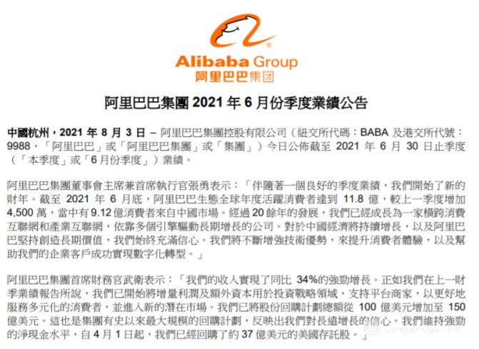 巴巴在 19 年定价 176 港元上市,在 20 年年底创了 307 港元的高位,然后因蚂蚁上市挞 Q 和科技股爆破,再加上政策整改,现价已回到跟当年上市差不多的水平。股价是回到 2 年前,业务却一直向前行,不断增长创出业务新高点,那就来看看本季表现如何?