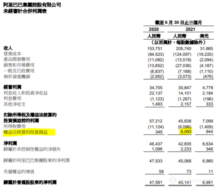 其实,大家有认真看财报的话,核心业务的盈利是倒退的。本季的增长完全是来自蚂蚁集团和权益法核算的投资贡献了 60 亿元的利润,意味着巴巴有可能要寻找更多的战略投资来支持增长了。