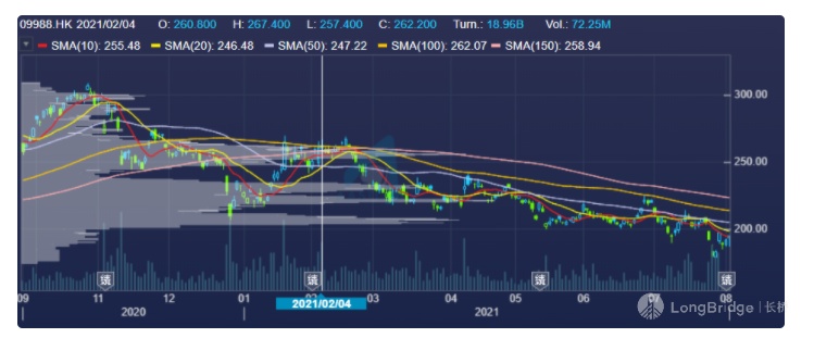 又到了一季一度猫先生最关心之中的巴巴$BABA-W(09988.HK) 季度业绩了!恭喜又撑过了一季了!在分析之前之看看巴巴在香港上市之后股价走势如何: