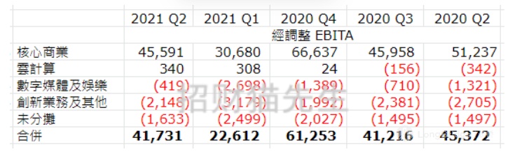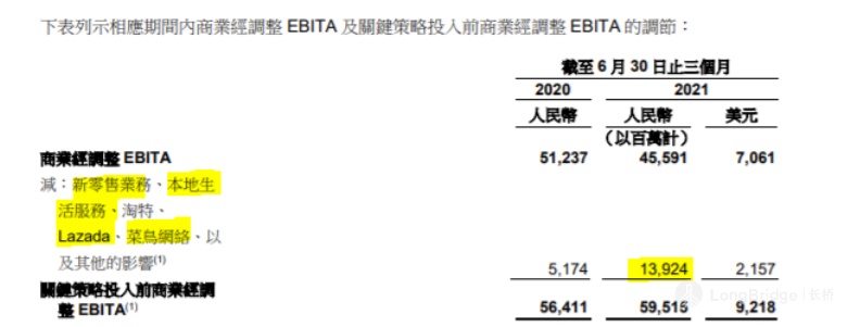 另外再带大家看一看另一要点,新零售,本地生活,菜鸟等业务,虽然管理层常谈到这些业务的收入/订单火速上升,在盈利能力上仍然是拖累集团的。如果对这些称呼不熟悉,它们就是饿了么,口碑,盒马等等相关的业务。业绩会上管理层好像说道饿了么订单多了 50%,可是估计还是未有盈利,旁边的美团$MEITUAN(03690.HK) 可已经赚钱了,这战斗是苦的。