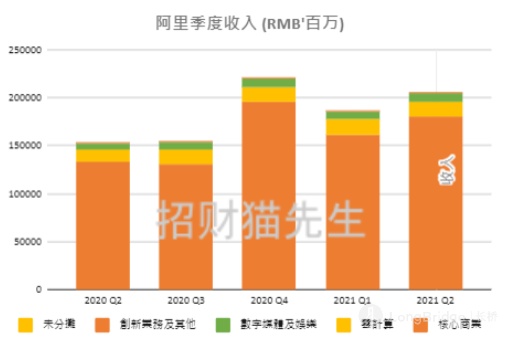 猫先生整合了过去四季的资料来分析一下,本季的收入已跟得上双十一的 Q4,比较上年也有不错的增长。注意到的是 2021 Q1 春节的表现也不错,但这样反观电商节日已经对买家来说不够特别,爆发力已大不如前。这也反映在阿里的核心商业增长上,按年只有增长了 34%,比起以往随便都是四五成的增长,在有 618 的加持下不算出息,亦较逊于市场预期。