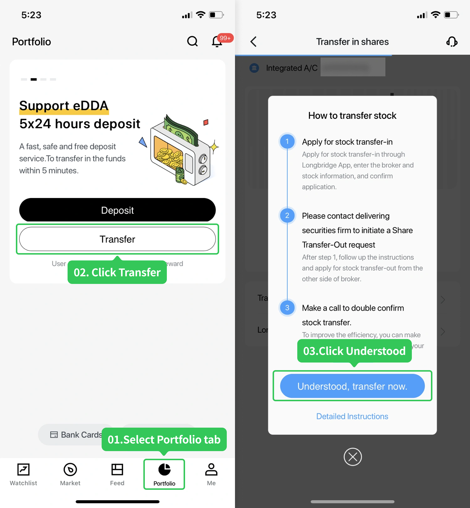 Step 1. Go to the Longbridge App > Portfolio > Transfer to submit a transfer-in application. If you have already deposited funds, select Portfolio > More > Share Transfer-In.