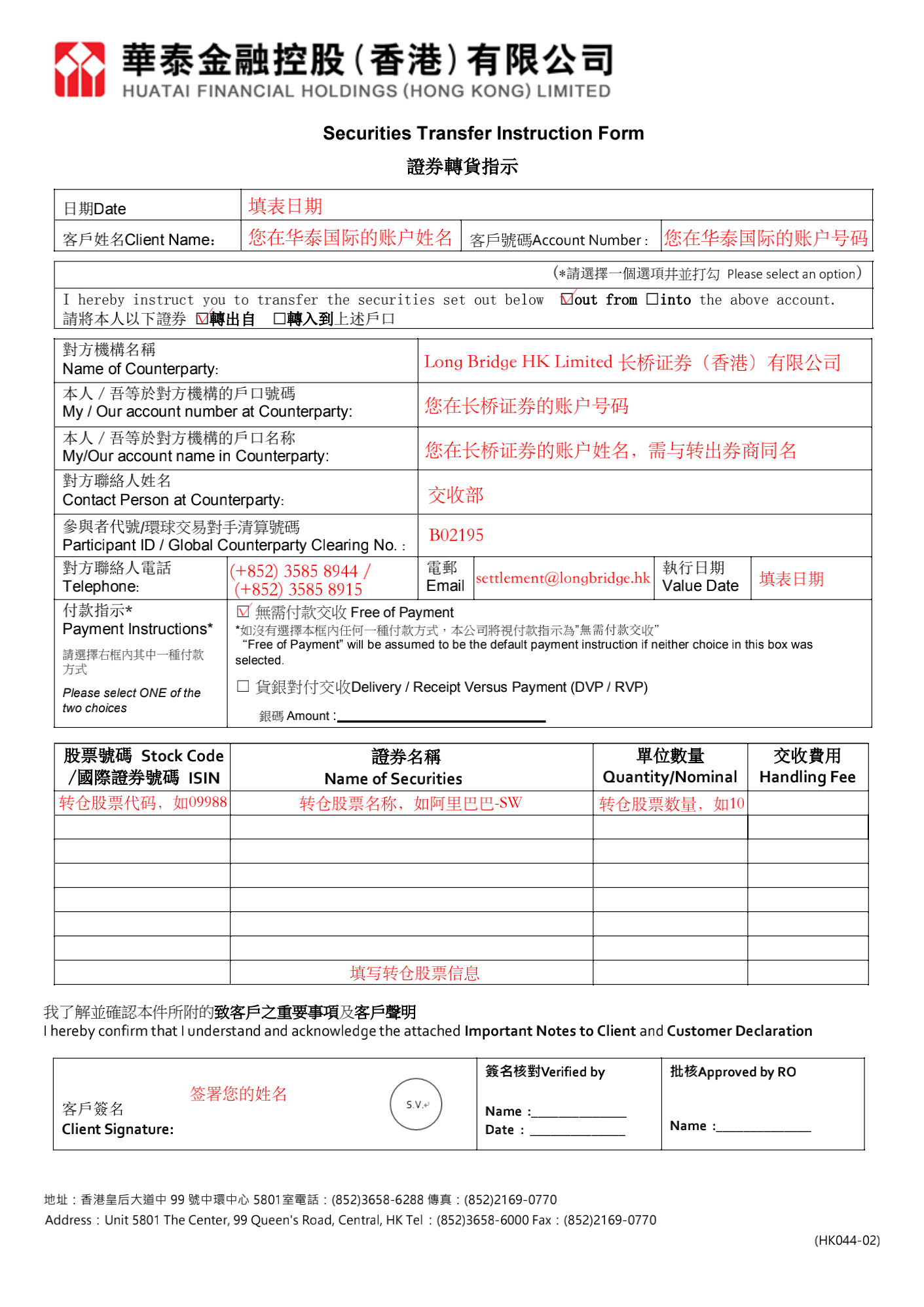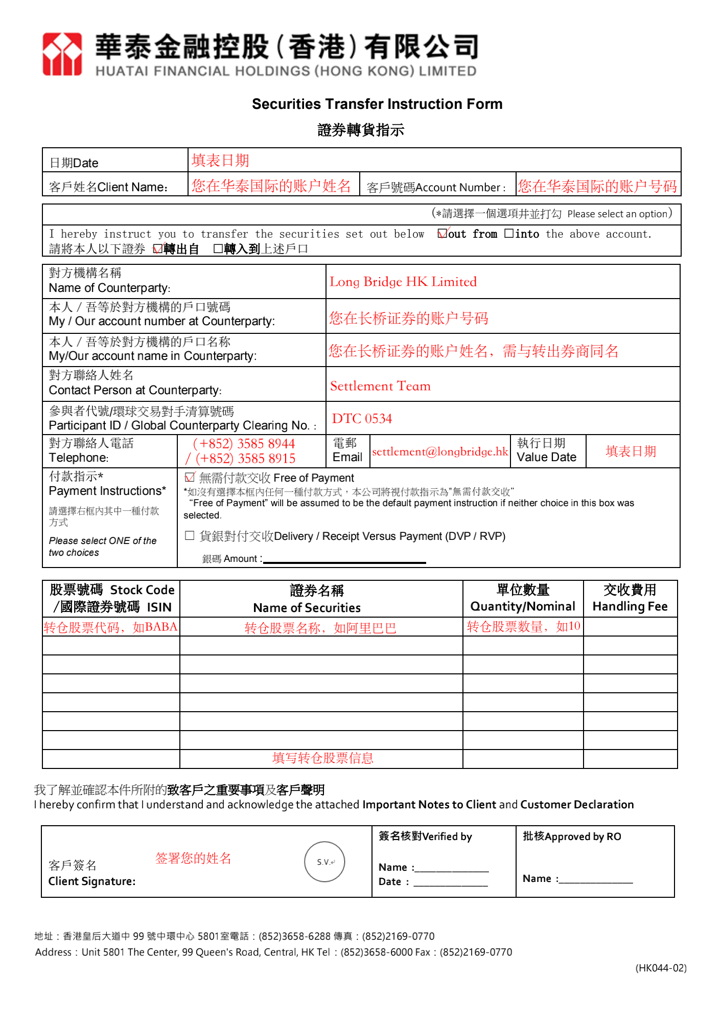 Step 1. Click https://www.htsc.com.hk/files/download/20190313102302702.pdf to download the Huatai Securities transfer form and print it.