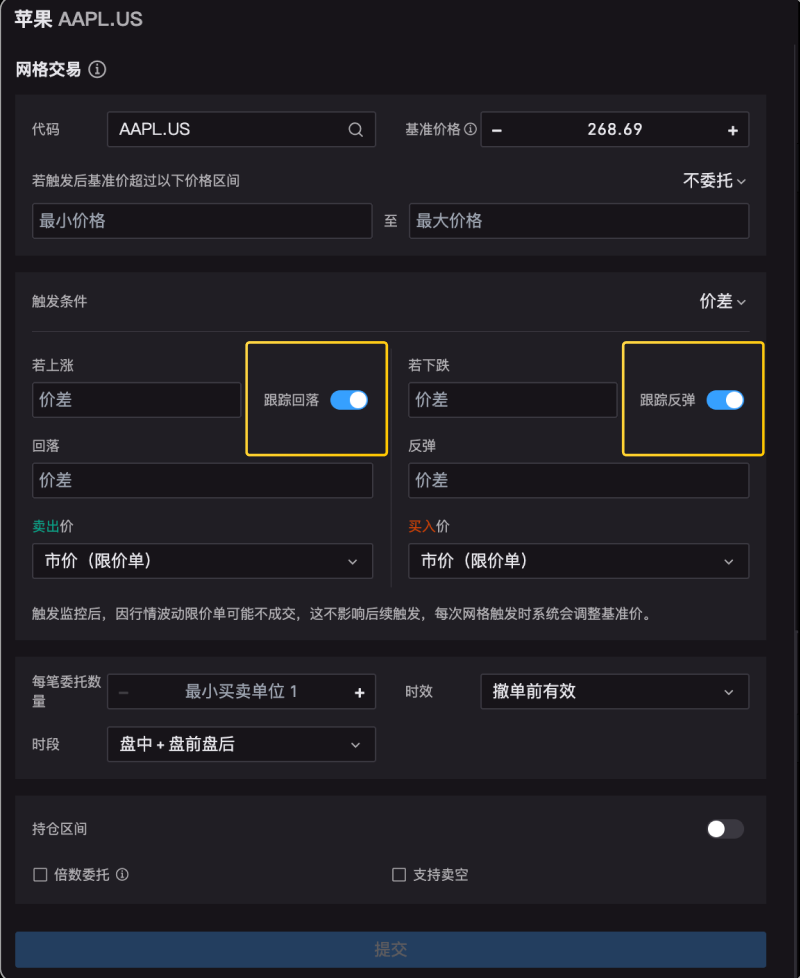 网格交易允许用户通过设置跟踪回落和反弹价差,精准捕捉价格波动,实现高抛低吸,优化交易策略。