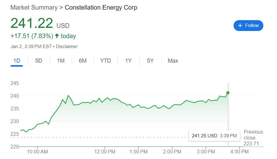 On Thursday, January 2, Eastern Time, the three major U.S. stock indices fell on the first trading day of 2025. The Nasdaq, which had risen more than 1% in early trading, dropped 1% at midday. However, Constellation Energy (CEG), listed on Nasdaq, opened high and maintained its upward trend, closing nearly 8% higher, poised to rebound to its highest closing level since December 6, erasing nearly a month of losses.