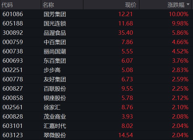 Retail stocks showed unusual upward movement in the morning session, with Guoguang Chain and Guofang Group hitting the daily limit. Zhongbai Group, Bubugao, Xujiahui, Sanjiang Shopping, and Guangbai Co., Ltd. also followed suit.