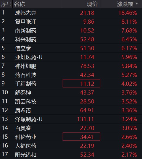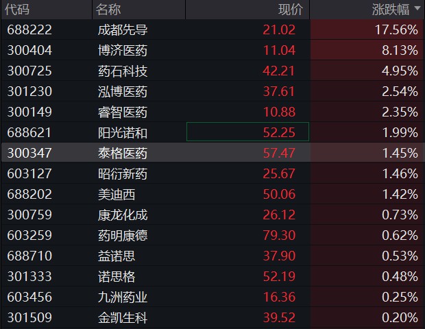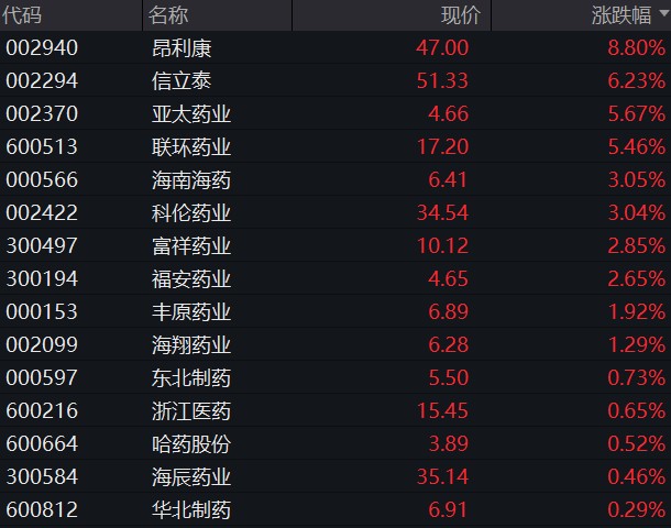 A-share pharmaceutical stocks rose, with antibiotics, CRO, and other sectors leading the gains. Among them, Angli Kang, Xinlitai, and Asia-Pacific Pharmaceutical had significant increases, with Chengdu Xian Dao rising over 16%. Boji Pharmaceutical, Yaoshi Technology, and Hongbo Pharmaceutical also saw gains.