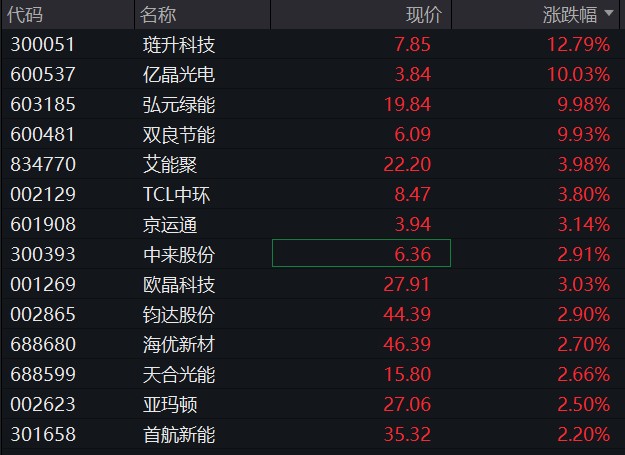 The A-share photovoltaic sector opened actively, with Shuangliang Energy and Huangshi Group hitting the daily limit. Zhonglai Co., TCL Zhonghuan, Yijing Optoelectronics, Oujing Technology, and GCL-Poly Energy also opened high.