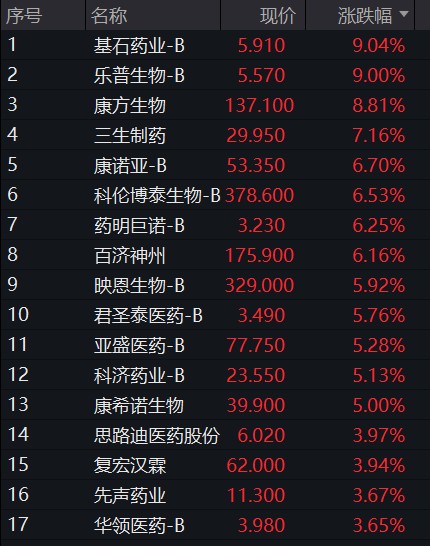 Hong Kong biotechnology stocks strengthened at the beginning of the session, with CanSino Biologics rising over 10%, Kelun-Bio rising over 6%, BeiGene rising over 5%, and Kingstar Bio, Tigermed, and others rising over 4%.