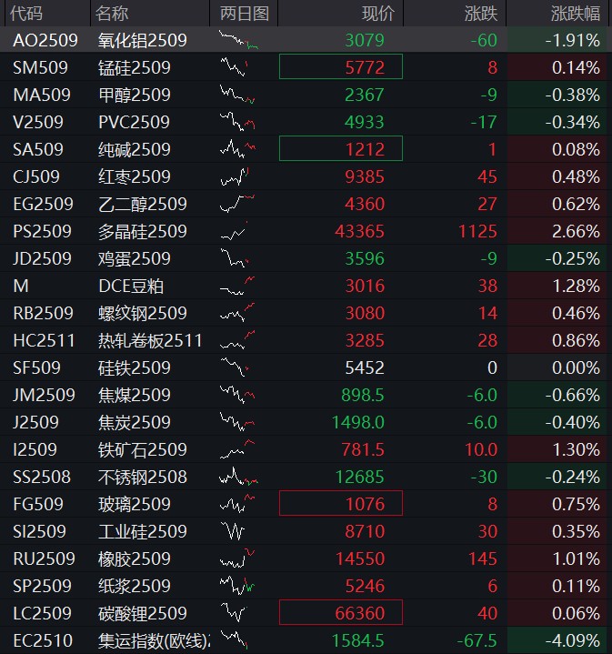 Commodity futures opened, with the main contract for polysilicon rising over 3%, iron ore, cotton, soybean meal, cotton yarn, hot-rolled steel, and soybean No. 2 rising over 1%. The shipping index for Europe fell over 2%, and alumina and LU fuel fell over 1%.