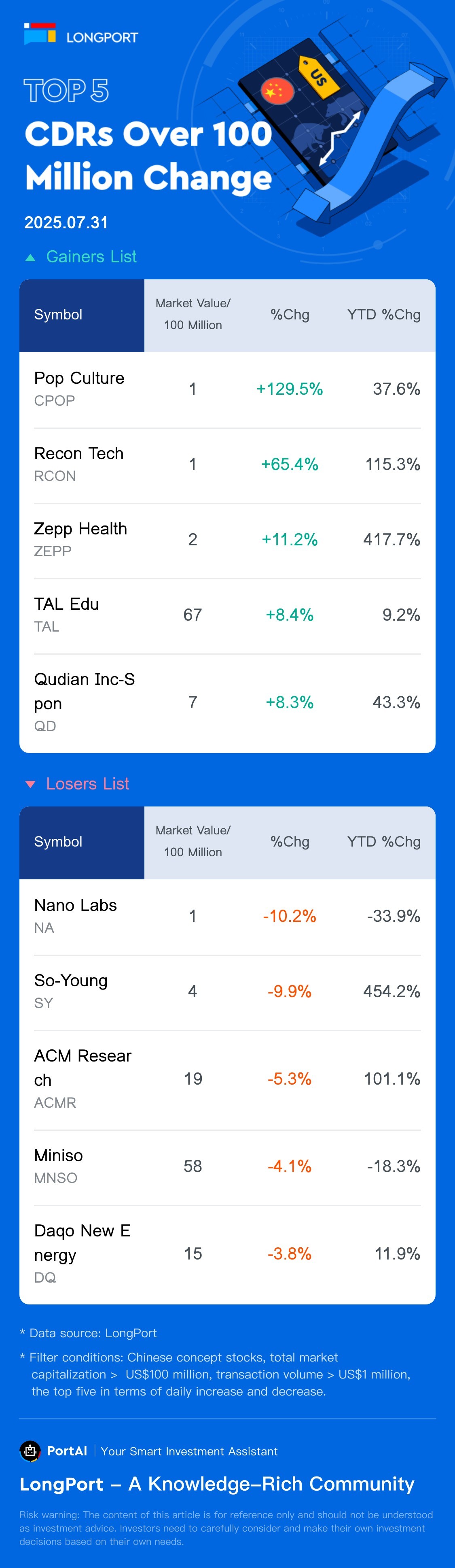 Pop Culture(CPOP) rose 129.51%, with a trading turnover 32.1 Million USD, and a year-to-date rose 37.6%. Recon Tech(RCON) rose 65.44%, with a trading turnover 11.9 Million USD, and a year-to-date rose 115.3%. Nano Labs(NA) fell 10.17%, with a trading turnover 2.6 Million USD, and a year-to-date fell 33.9%. So-Young(SY) fell 9.92%, with a trading turnover 3.7 Million USD, and a year-to-date rose 454.2%.
