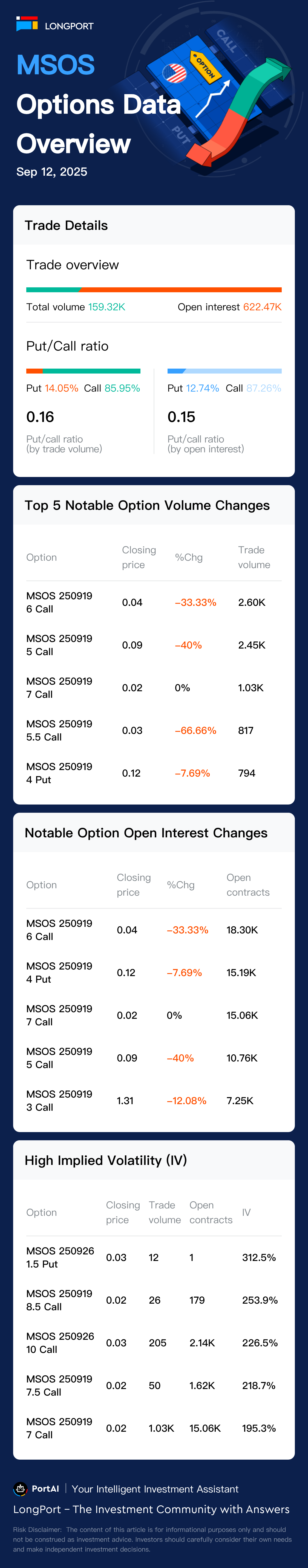 The top volume gainer was the 6 dollars Call option expiring on September 19, 2025, with 2595 contracts traded.