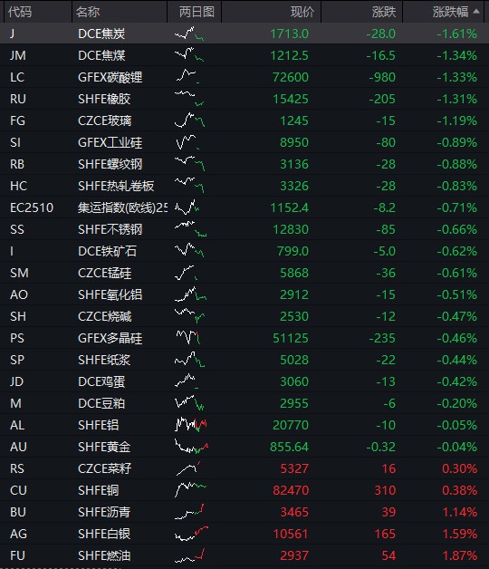Commodities: Domestic commodity futures generally fell. As of the time of writing, coking coal, coke, lithium carbonate, rubber, and glass fell by more than 1%. Industrial silicon, rebar, hot-rolled coils, container shipping index, stainless steel, iron ore, ferrosilicon, alumina, caustic soda, polysilicon, pulp, eggs, and soybean meal also fell.