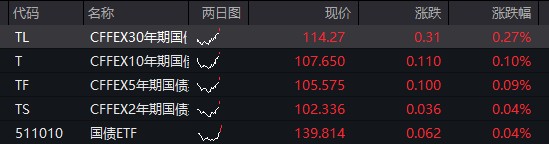 Bond market: Government bond futures rebounded across the board. As of the time of writing, the 30-year main contract rose by 0.27%, the 10-year main contract rose by 0.10%, the 5-year main contract rose by 0.09%, and the 2-year main contract rose by 0.04%.