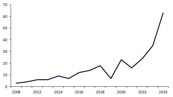 Between 2009 and 2018, annual review designations awarded to ADCs increased steadily at a compound annual growth rate (CAGR) of 22%. Confidence in ADCs grew gradually over this period, as the science and manufacturing processes behind this technology were refined and validated. Despite a 2019 drop in review designation activity, the following five-year timeframe (2019 to 2024) represents an era of intense activity, as review designation awarding increased at a CAGR of 73.3%. In 2024, the FDA handed out a record of 63 designations, nearly double the previous peak of 35 in 2023 (Figure 1). The dramatic increase highlights the FDA’s growing intent to facilitate the market entry of these precision therapies.