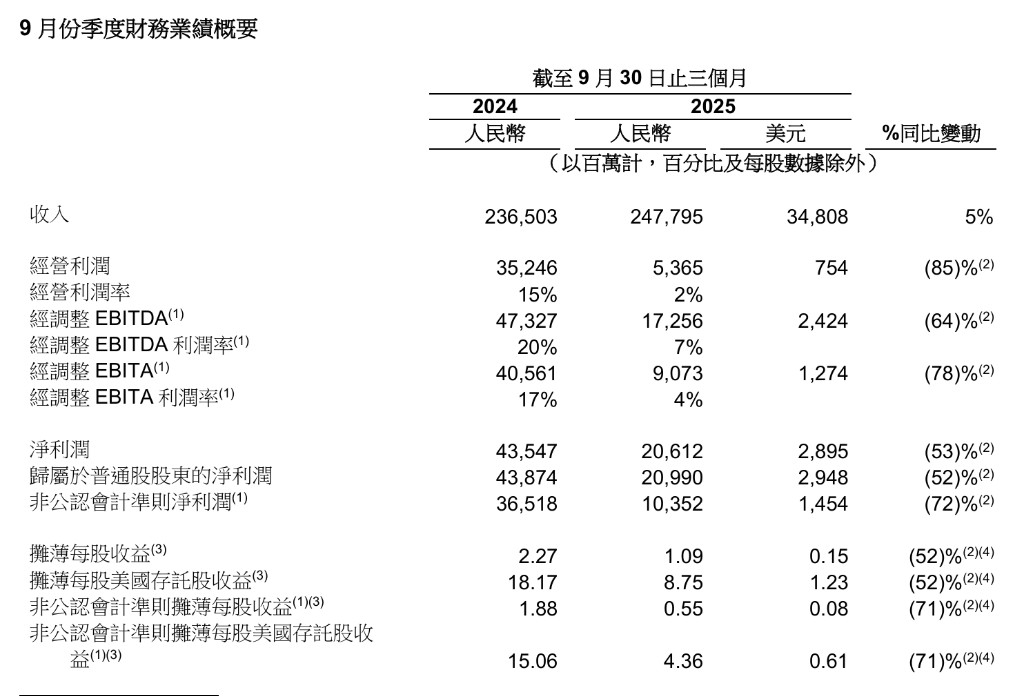 Alibaba Group's revenue for the second quarter was RMB 247.8 billion, a year-on-year increase of 4.8%, slightly above market expectations, but the adjusted net profit plummeted 72% year-on-year to RMB 10.35 billion, significantly under pressure on profitability.