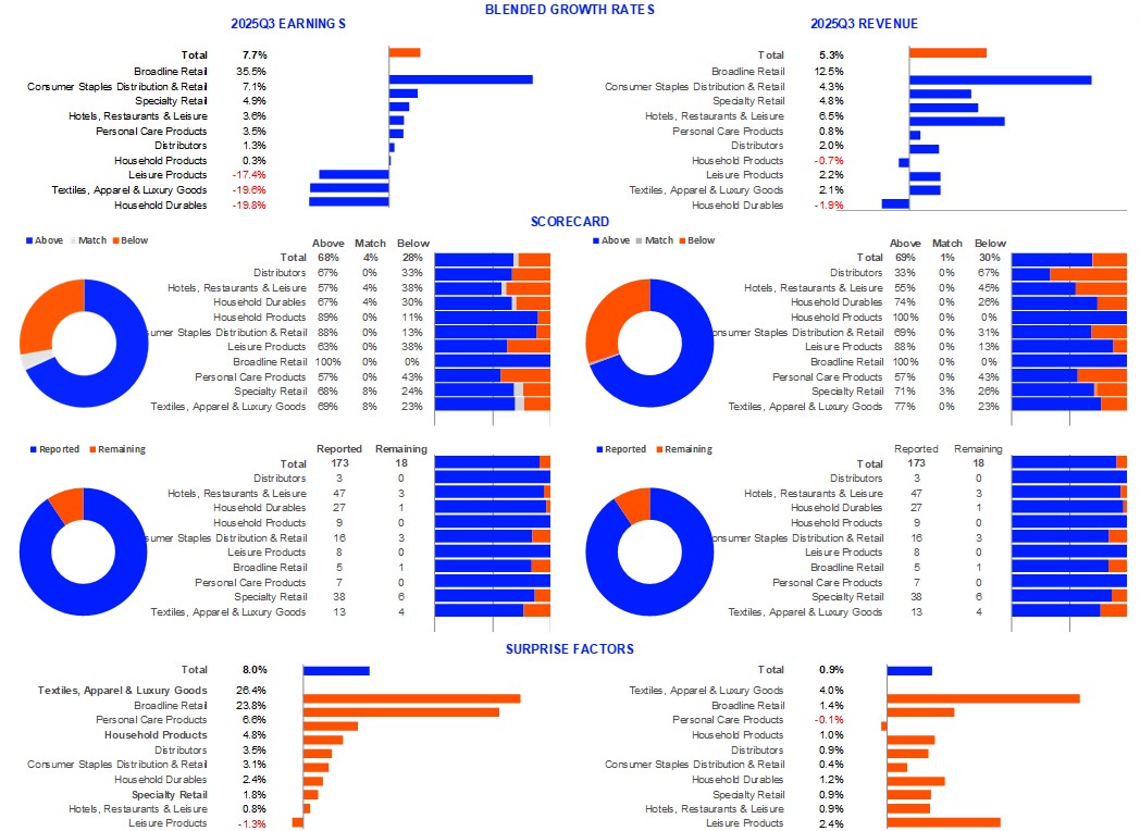 To date, 173 of the 192 companies in our LSEG Retail/Restaurant Index have reported their EPS results for Q3 2025, representing 91% of the index. Of those companies that have reported their quarterly results, 68% announced profits that beat analysts’ expectations, while 4% delivered on-target results and 28% reported earnings that fell below estimates. The Q3 2025 blended earnings growth estimate now stands at 7.7%.