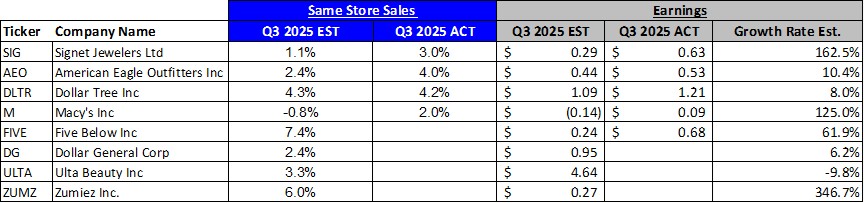 Here are the latest Q3 2025 earnings and same store sales retail estimates: