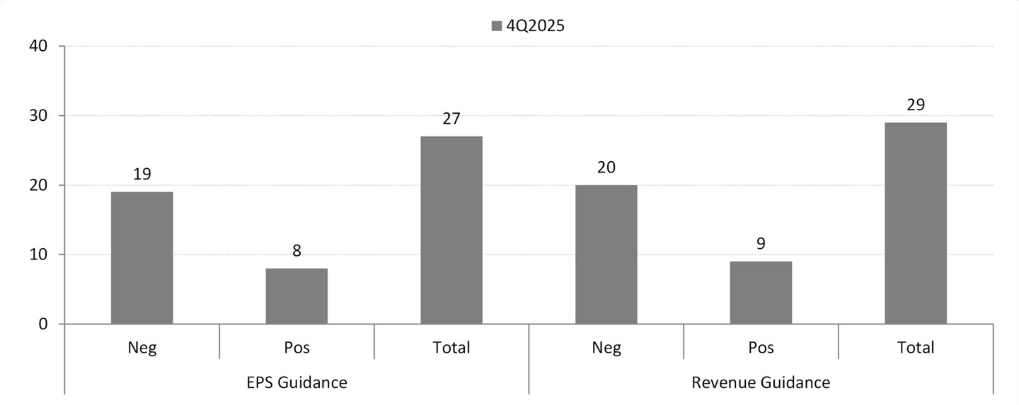 As retailers provide their outlook for Q4 2025 earnings, 19 companies have issued negative preannouncements, while 8 have provided positive EPS guidance so far (see Exhibit 3). Among those offering revenue guidance, 20 retailers warned of disappointing results, while nine indicated that revenue may exceed prior expectations.
