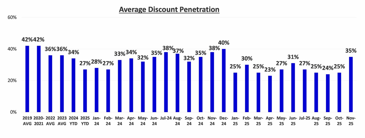 Meanwhile, the latest average percent discount stands at 33%, which is below last year’s level and below the 2025 year-to-date average of 35%. This suggests retailers are adopting a more targeted approach, fewer items on sale and smaller reductions to safeguard margins (see Exhibit 5).