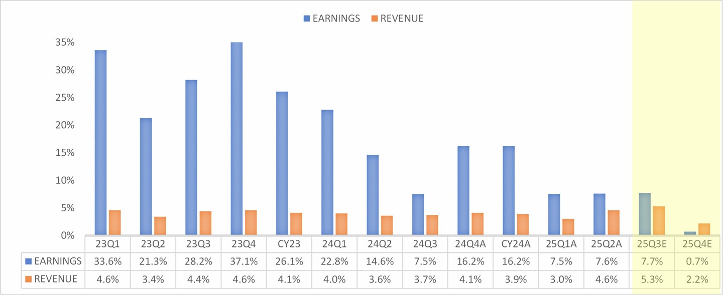 Earnings growth is also expected to moderate, with estimates pointing to 7.7% in Q3 and 0.7% in Q4 2025. This slowdown is primarily driven by softening consumer demand and elevated cost pressures, particularly from tariffs, compared to the prior year.
