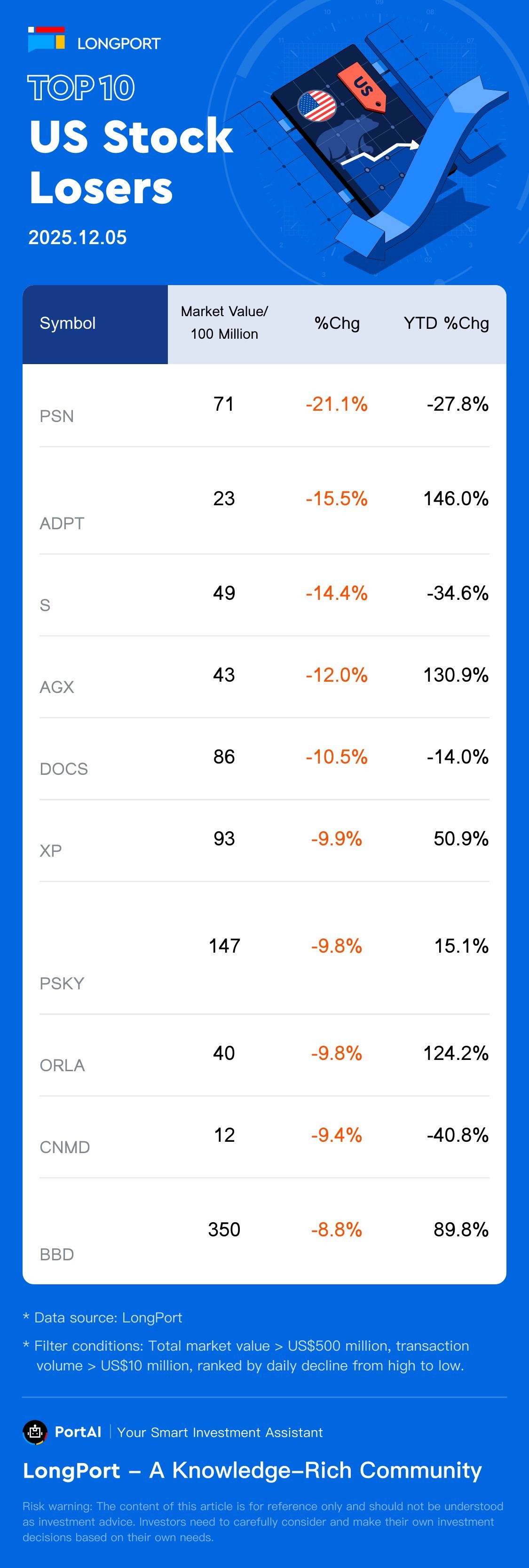 Parsons(PSN) fell 21.09%, with a trading turnover 760.5 Million USD, and a year-to-date fell 27.8%. Adaptive Biotechnologies(ADPT) fell 15.52%, with a trading turnover 109.4 Million USD, and a year-to-date rose 146%. SentinelOne(S) fell 14.44%, with a trading turnover 518.9 Million USD, and a year-to-date fell 34.6%.