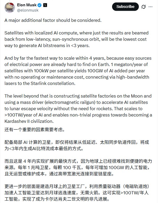 How to understand the value of SpaceX? Musk: In 3-4 years, "space supercomputing" will be the lowest-cost computing power