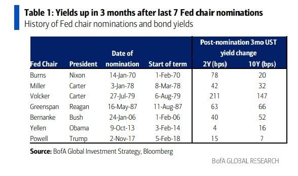 Historical data shows that in the seven nominations of Federal Reserve Chairmen since 1970 (Burns, Miller, Volcker, Greenspan, Bernanke, Yellen, Powell), yields have risen every time within three months, with the 2-year yield averaging an increase of 65 basis points and the 10-year yield averaging an increase of 49 basis points.
