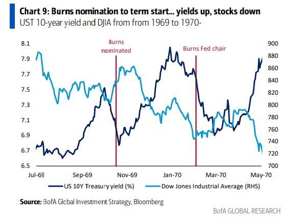 Notably, from Nixon's nomination of Arthur Burns in October 1969 to the start of his term in February 1970, the yield on the U.S. 10-year Treasury rose by 100 basis points, and the Dow Jones Industrial Average fell by 11%.