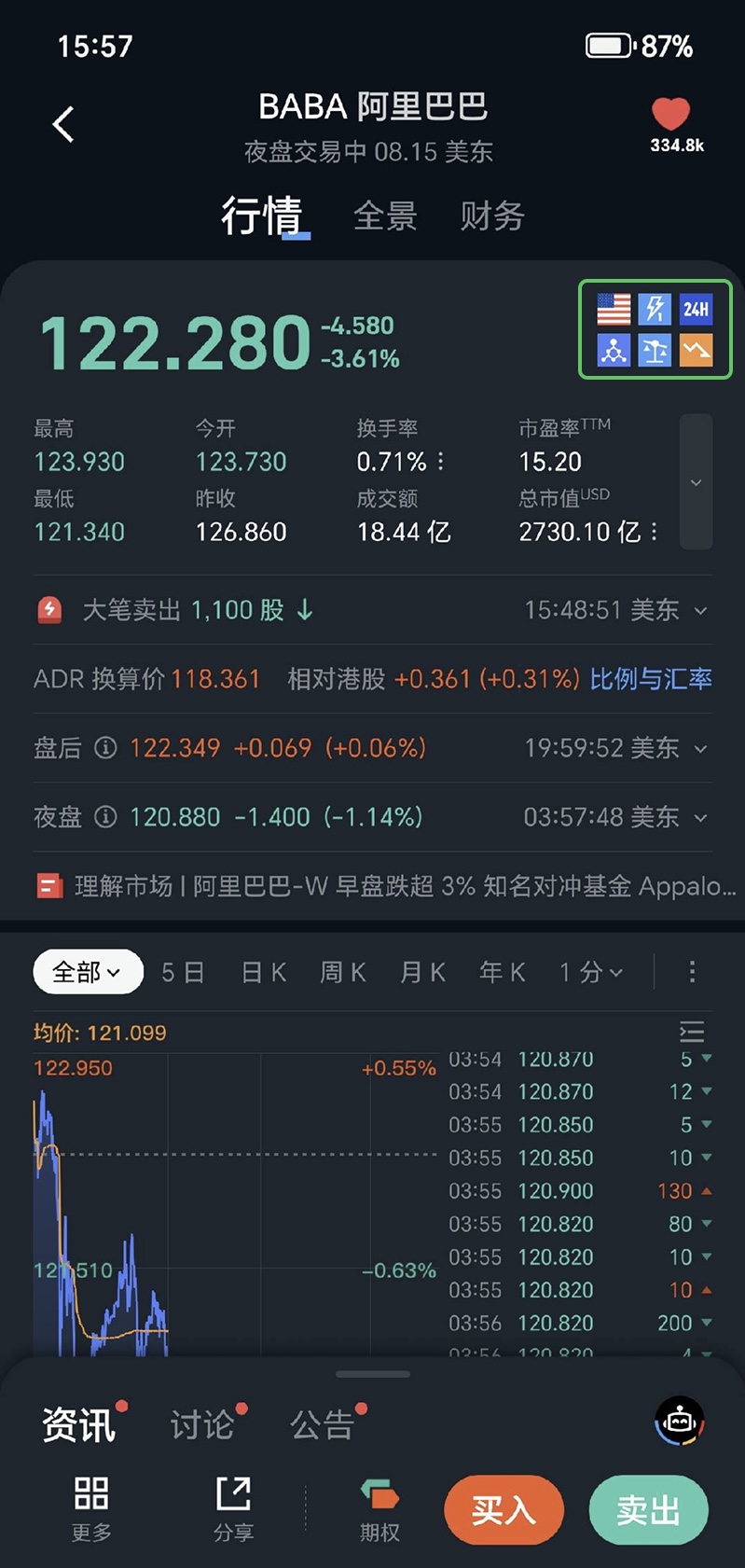 在相应股票的个股详情页 > 行情 > 股票当前价格 > 右侧 icon,如下图绿框位置所示。