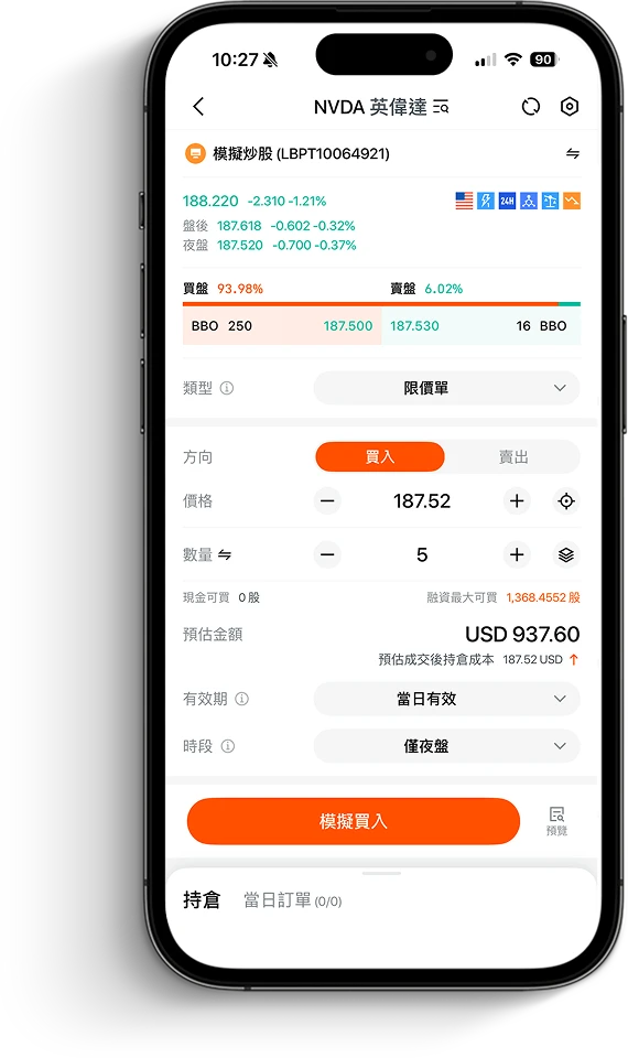 美股包含夜盤、盤前、常規交易及盤後時段,長橋支援 24 小時美股交易,亞太時區白天同樣可以下單,亞洲投資者無需特意捱夜交易。