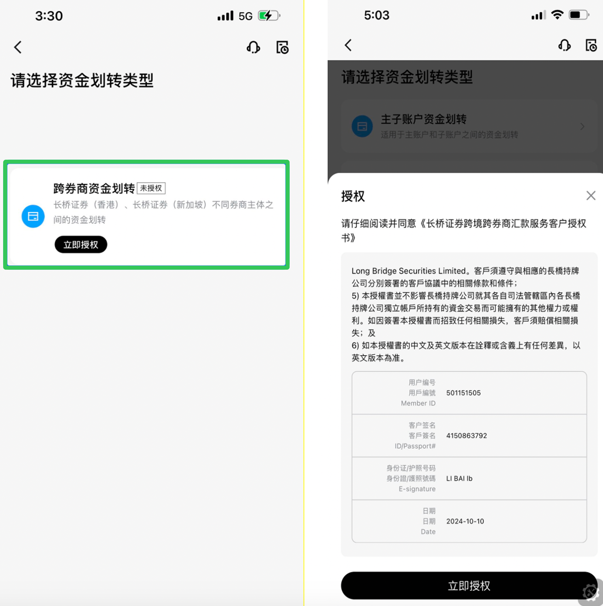 選擇跨券商資金劃轉,發起授權申請。您需要將授權協議滑動至底部,確認個人信息無誤後,方可點擊立即授權。請注意,若您僅長橋證券(香港)一個賬戶,或者僅長橋證券(新加坡)一個賬戶,則無法使用跨券商資金劃轉功能。