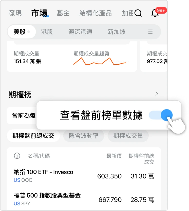盤前時段可交易 QQQ、SPY、AAPL、TSLA 等主流美股及 ETF。