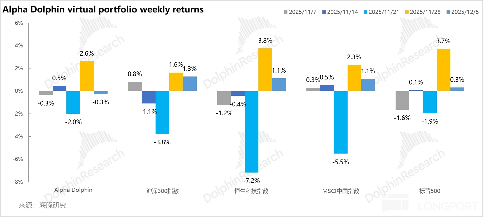 Last week, Dolphin Research’s virtual portfolio Alpha Dolphin made no changes. It fell 0.3%, underperforming CSI 300 (+1.3%), MSCI China (+1.1%), Hang Seng Tech (+1.1%), and the S&P 500 (+0.3%).