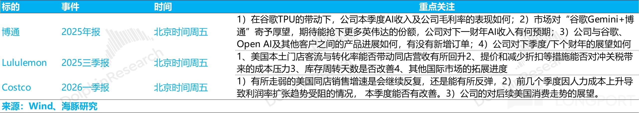 It is the tail end of US earnings season, with only Broadcom left among AI names to gauge orders for cost-efficient compute ASICs. Two relatively soft consumer names, Lululemon and Costco, will also report; key watch items are below.