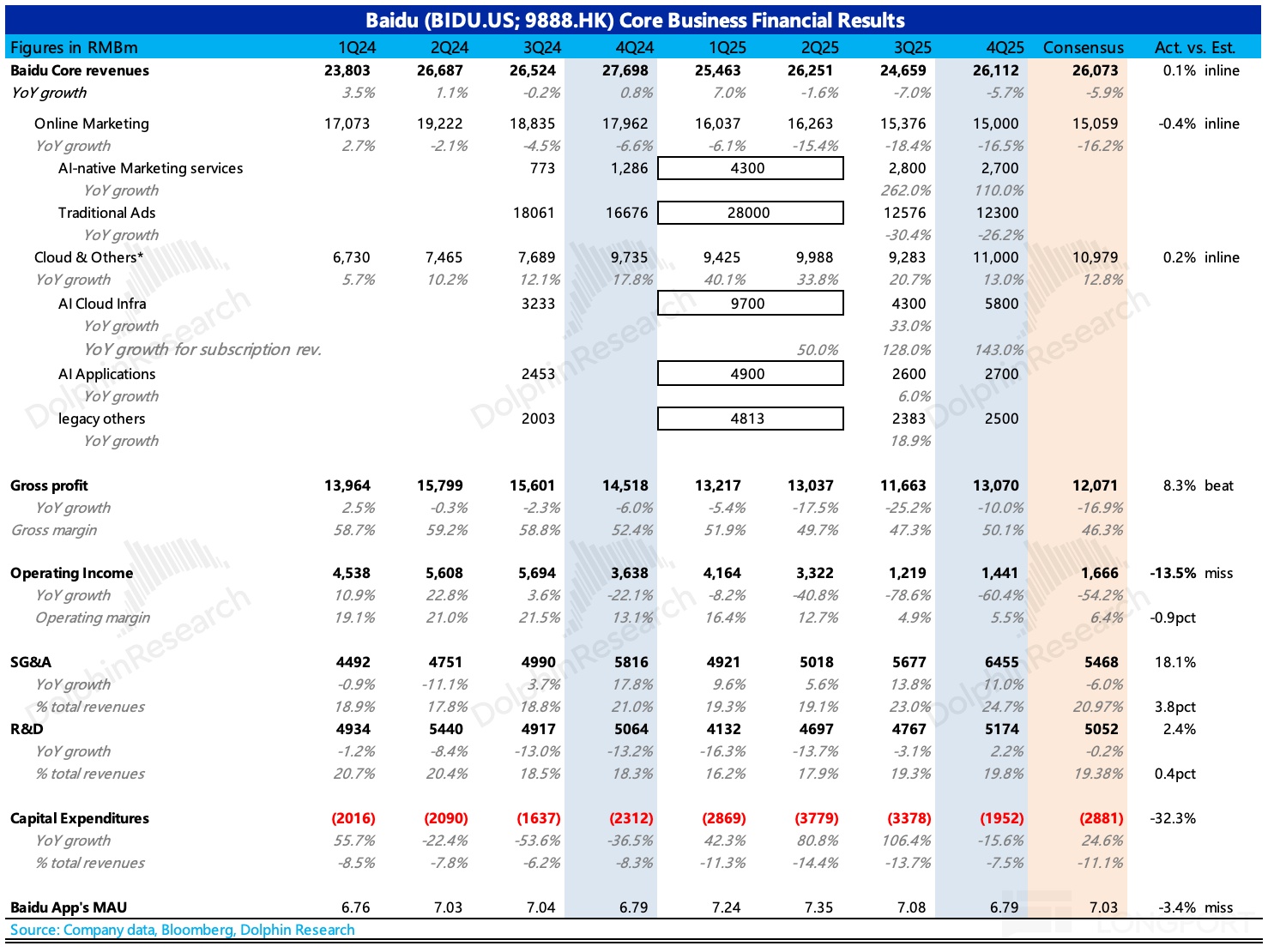 Below is Dolphin Research's compiled Trans of $Baidu(BIDU.US) FY25 Q4 earnings call. For the earnings read-through, cf. '百度:回购托底,但翻盘还得靠 “叙事”'.