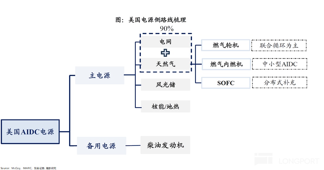 Demand side: off‑grid self‑build is gaining share Facing exhausted grid capacity and long interconnection queues, U.S. AIDC is shifting toward on‑site generation and microgrids. Supply architectures split into primary and backup sources.