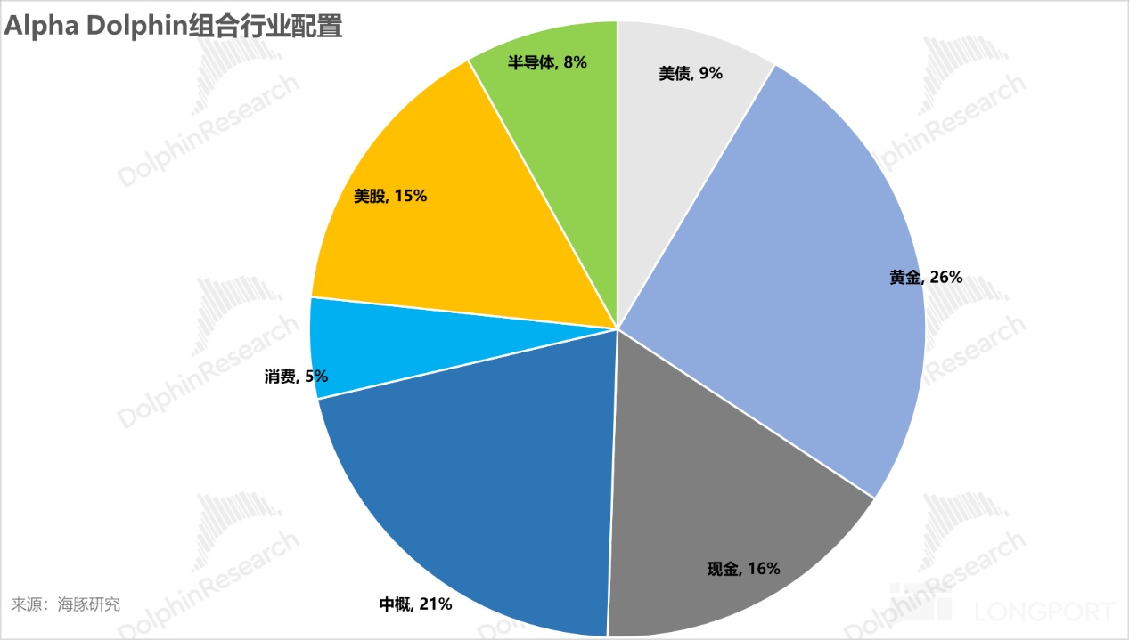 The Alpha Dolphin virtual portfolio holds 18 stocks and equity ETFs, with 7 at benchmark weight and the rest underweight. Outside equities, exposure is concentrated in gold, U.S. Treasuries, and USD cash, with equities vs gold/USTs/cash roughly 50:50.