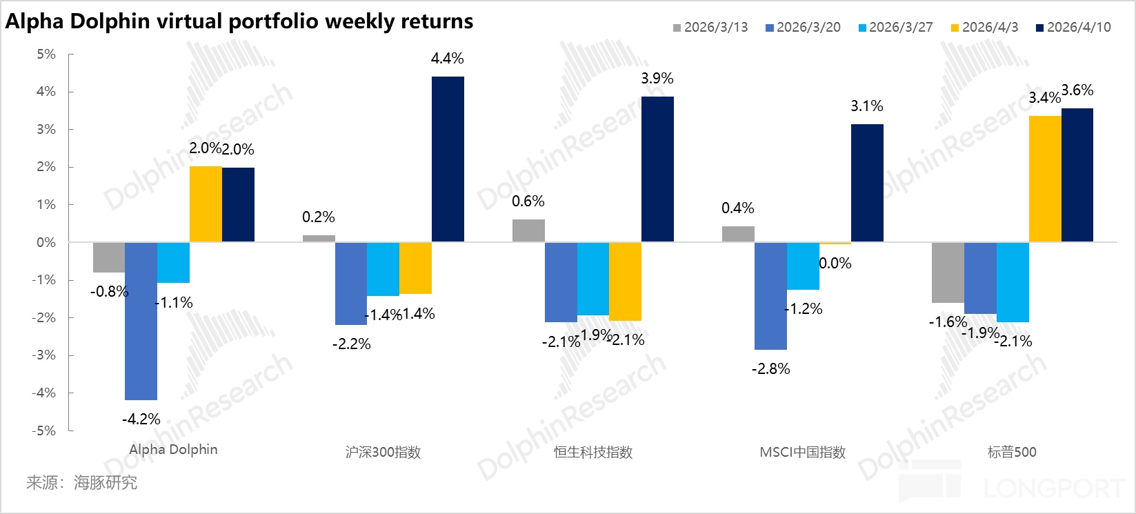 Last week, Dolphin Research’s virtual portfolio Alpha Dolphin made no changes. The portfolio returned 2% for the week, underperforming CSI 300 (+4.4%), MSCI China (+3.1%), HSTECH (+3.9%), and the S&P 500 (+3.6%).
