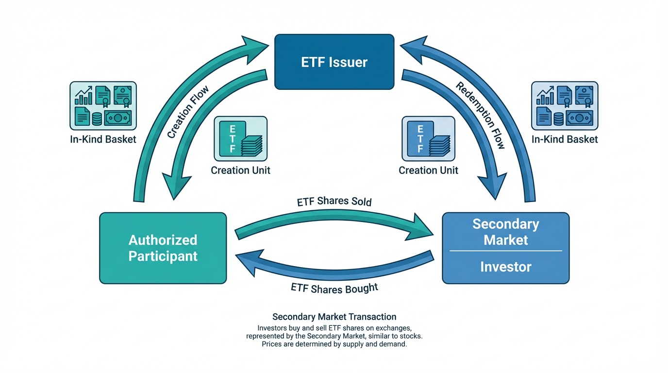 当 ETF 市场价格高于净值时,AP 会组合买入标的证券并交付给 ETF 发行方,从而获得对应的申购单位,这些份额随后在二级市场出售,将价格拉回净值附近。若 ETF 价格低于净值,则过程反向。这种套利机制确保了 ETF 价格的高效运作,但相应地也带来了费用。
