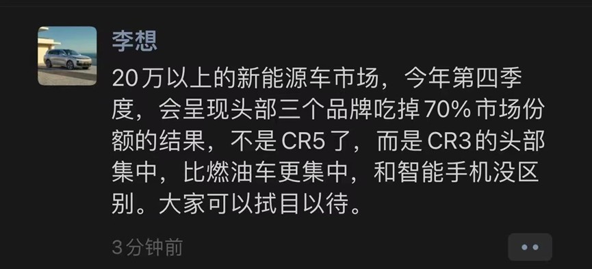 正如理想董事长李想所说 “20 万以上的新能源车市场,今年第四季度,会呈现头部三个品牌吃掉 70% 市场份额的结果,比燃油车更集中”。