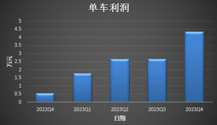 在其他造车新势力还在为盈亏平衡而努力的时候,2023 年第四季度,理想的净利润达到 57.5 亿元,同比增长 2068.2%,环比提升 104.5%。单车利润也从去年四季度的 5700 元增长到如今的 43560 元,持续突破新高。