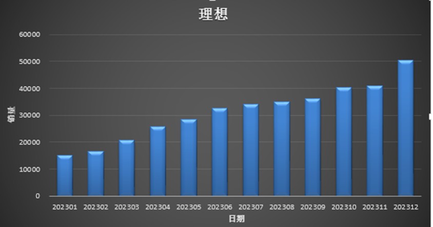 2023 年第四季度,理想再度创下销量新高,销量高达 13.2 万辆,超过了此前预估的 12.5-12.8 万辆的交付量水平。理想不仅以 12 个月连续环比递增的姿态实现了全年销量目标,而且在 12 月首度突破 5 万辆大关。